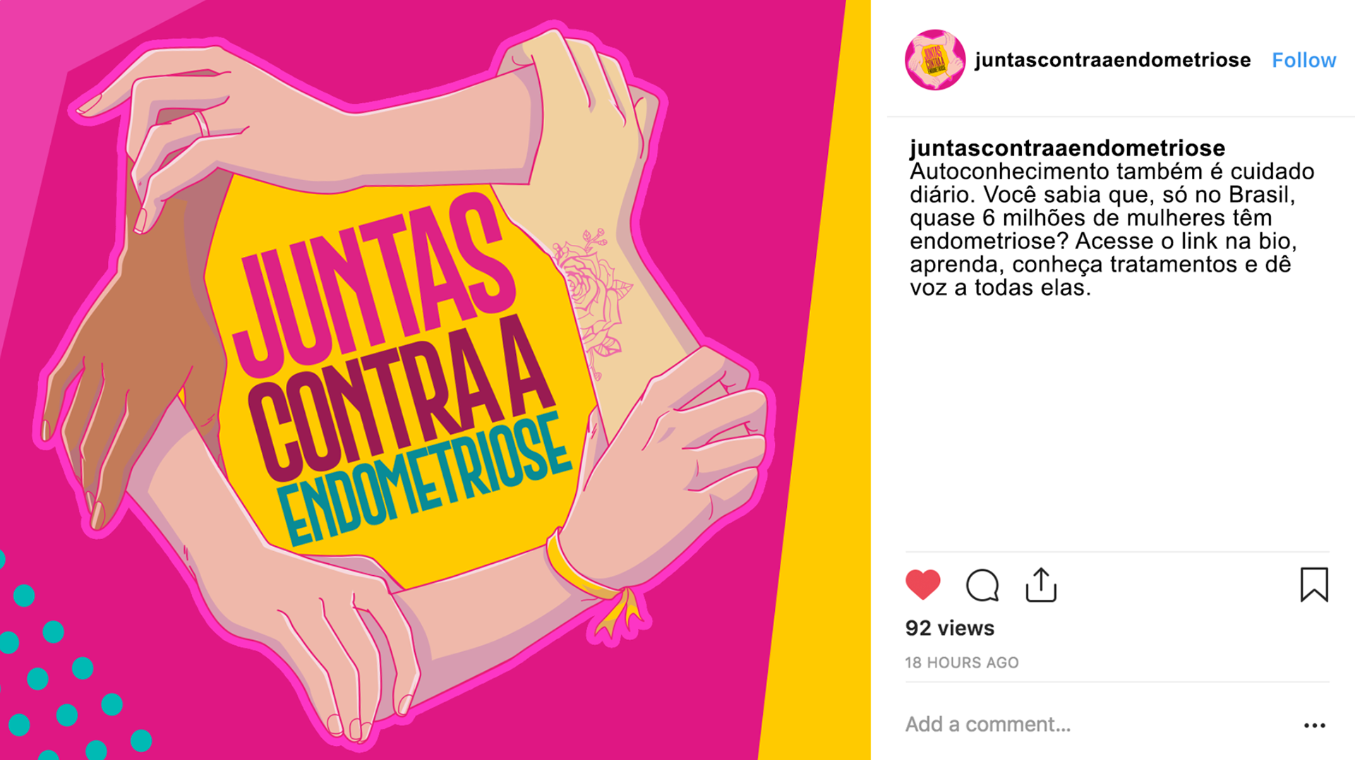 Objetivo da campanha: dar visibilidade ao tema, gerar a discussão sobre a Endometriose, mobilizar e conscientizar a população a fim de obter 100 mil apoiadores para que governo inclua o tratamento da endometriose no SUS.
